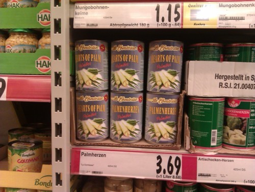 Palmito em alemão se chama Palmherzen ou Palmenherzen mas você tambem encontra pelo nome em inglês: hearts of palm.